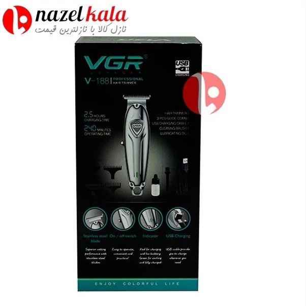 ماشین اصلاح موی صورت وی جی ار مدل V-188 مناسب اصلاح ریش و موی سر و خط زنی پرقدرت,یک ماشین اصلاح بسیار با کیفیت عالی میباشد این دستگاه دارای دوسرعته سرعت معمولی و پرسرعت همان توربو دو حالته کار میکند ماشین اصلاح قابلیت دوسرعته شدن را دارد و با شارژرهای همه موبایلهای دارای یو اس پی شارژ میشود و همچنین قابلیت استفاده همزمان با برق و شارژ را دارد.و دارای 3 عدد شانه 1 و 2 و 3 میباشد.