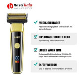 ویژگیهای این ماشین اصلاح شامل تیغههای فولادی تیز و مقاوم، باتری قابل شارژ با عمر طولانی، طراحی ارگونومیک