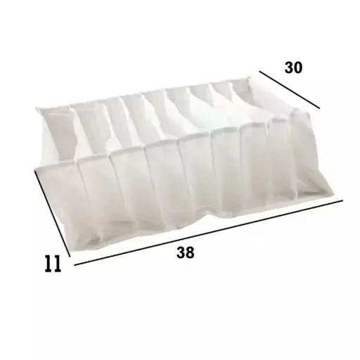 ابعاد:38x30x11 جنس:پارچه درباره محصول نظم دهنده کشو بسیار جادار و زیبا است و برای منظم کردن کشو و کمد به کار می رود .نشم دهنده در اندازهای مختلف وجود دارد این نظم دهنده به سایز لارج معروف است و در 9 قسمت می باشد و اندازهای روی بسته آن قید شده است به این ترتیب می باشد 38x30x11 cm
