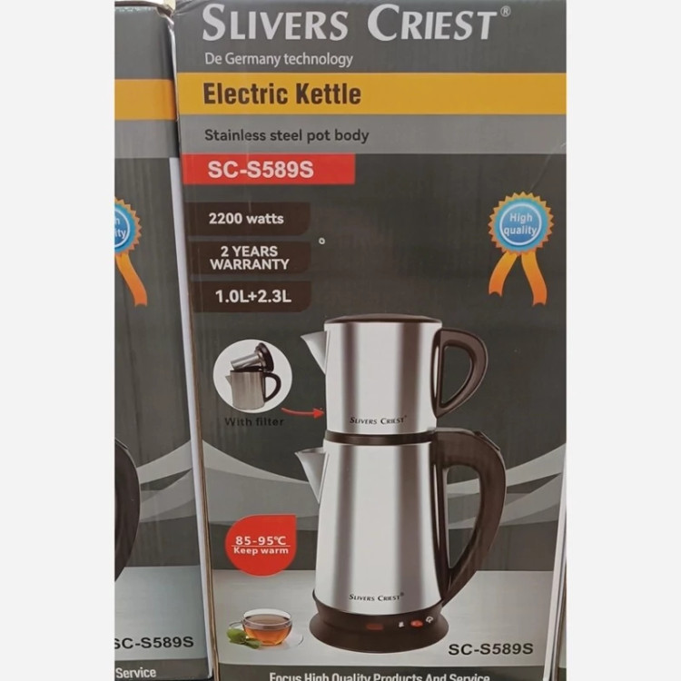 قدرت دستگاه 2200 وات ظرفت کتری 2.3 لیتر ظرفیت قوری 1 لیتر قابلیت گرم نگهدارند آب دارد سیستم قطع کن خودکار دارد چراغ نشانگر دارد جنس بدنه تمام استیل قابلیت چرخش 360 درجه فیلتر دارد