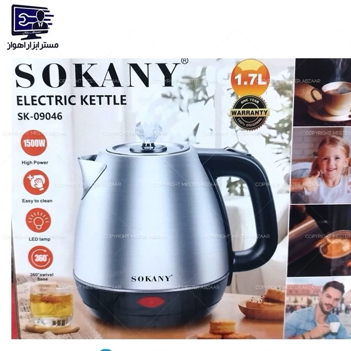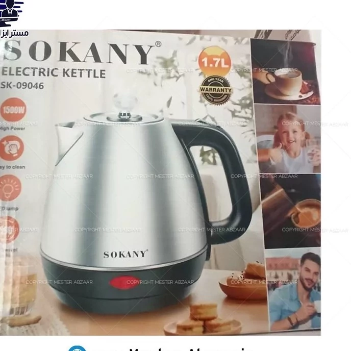کتری برقی سوکانی 1.7 لیتری 1500 وات بدنه استیل مدل SOKANY SK-09046 کد ۶۳۰۷