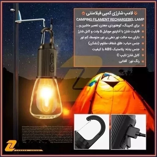 لامپ شارژی کمپینگ فیلامنتی برای کمپینگ، کوهنوردی، تعمیر ماشین، مواقع اضطراری و... قابلیت شارژ با کابل تایپ C